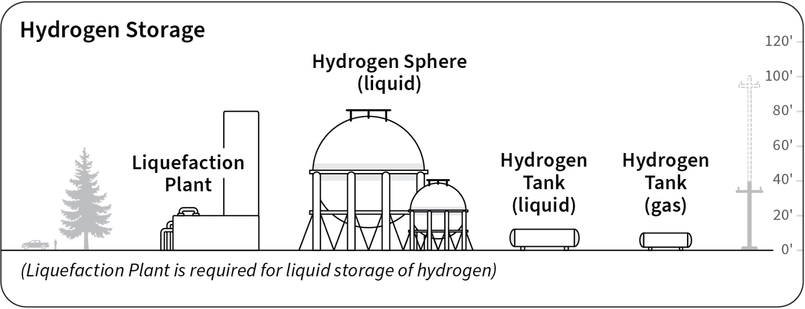 In general, liquid hydrogen storage requires a smaller area to store the same capacity of gaseous hydrogen, although it requires the addition of a liquefaction system. A green hydrogen storage facility may be co-located with a green hydrogen production facility, a standalone facility, or end-use location such as an industrial facility or fueling facility.