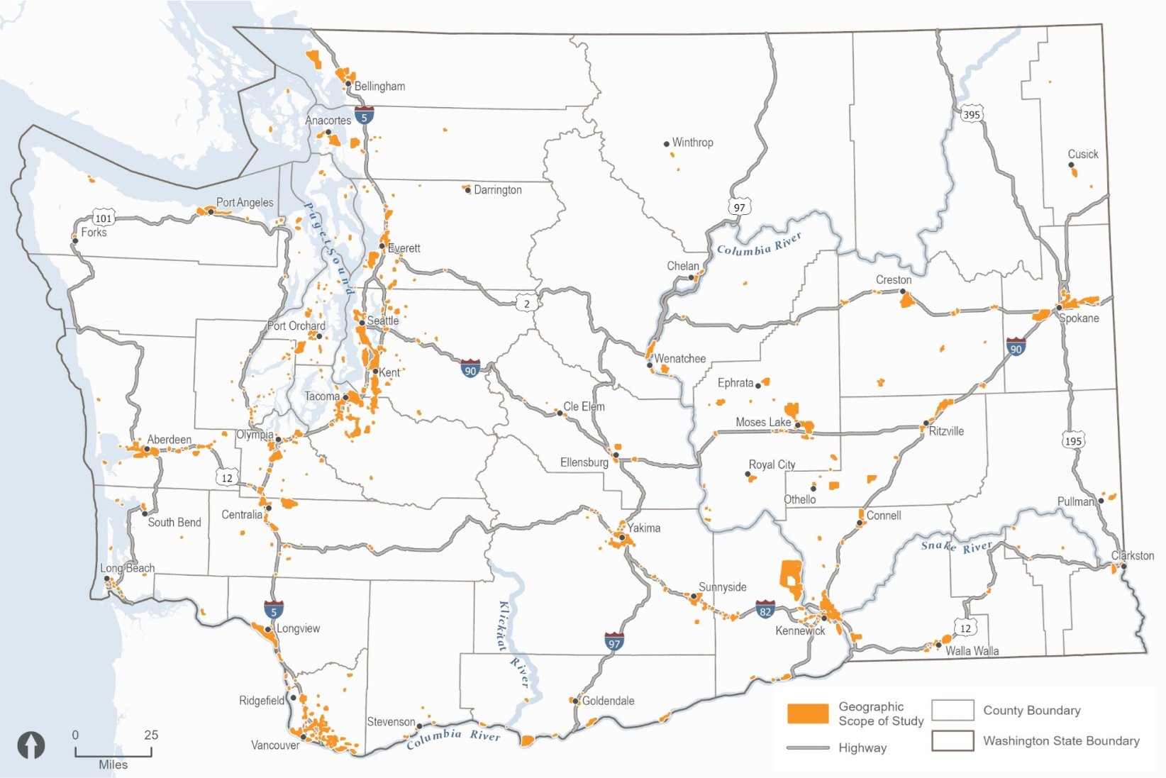 View PEIS Section 3The geographic scope for the PEIS includes areas throughout the state of Washington where green hydrogen facilities are likely to be developed based on available transmission lines, proximity to freight highway routes, and industrial or industrial-use supporting zoning. These lands include city and county industrially zoned areas or areas zoned to support industrial uses, such as areas with major port facilities that handle freight shipments, intermodal facilities, and airports.